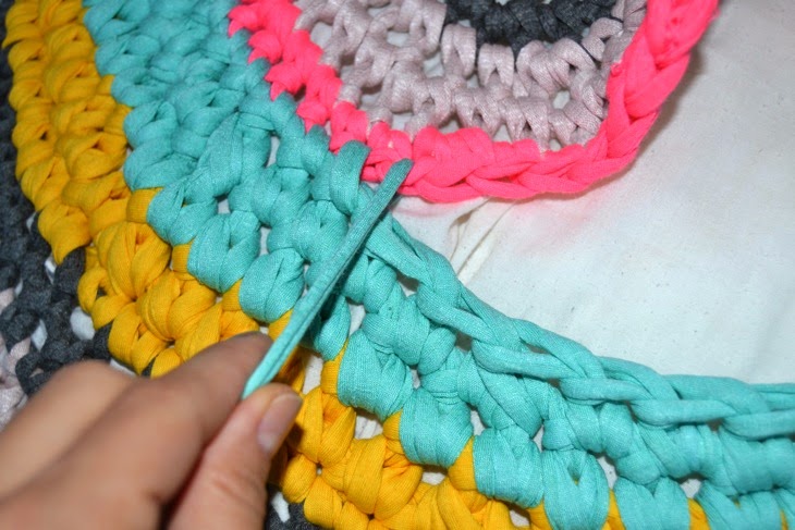 Cuando estoy terminando una vuelta y quiero cambiar de color, lo que hago es cerrar esa vuelta con un punto raso introduciendo ahí la hebra del nuevo color. Es decir, que no cierro con el color que tenía y luego empiezo con el nuevo color, sino que lo introduzco en el punto raso anterior. De esta manera los círculos de colores quedan más perfectos. Además esto permite, una vez que cortamos la hebra de trapillo, atarla con un nudo fuerte a la nueva hebra, que quedará por dentro del puff y no se ve.
