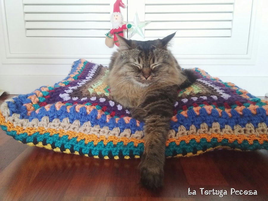 Se trata de un puff en forma cuadrada de granny square, como no tenia suficiente hilo de algodón, pues combiné con lana.Es muy colorido y creo que le va a gustar, creo eso porque a Mayi le chifla y desde que lo he acabado no se baja de él...como es grande y mullidito le encanta.Espero que al pequeño Marvin tambien le guste.