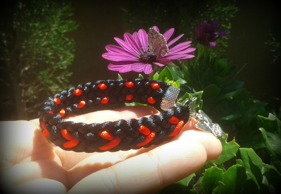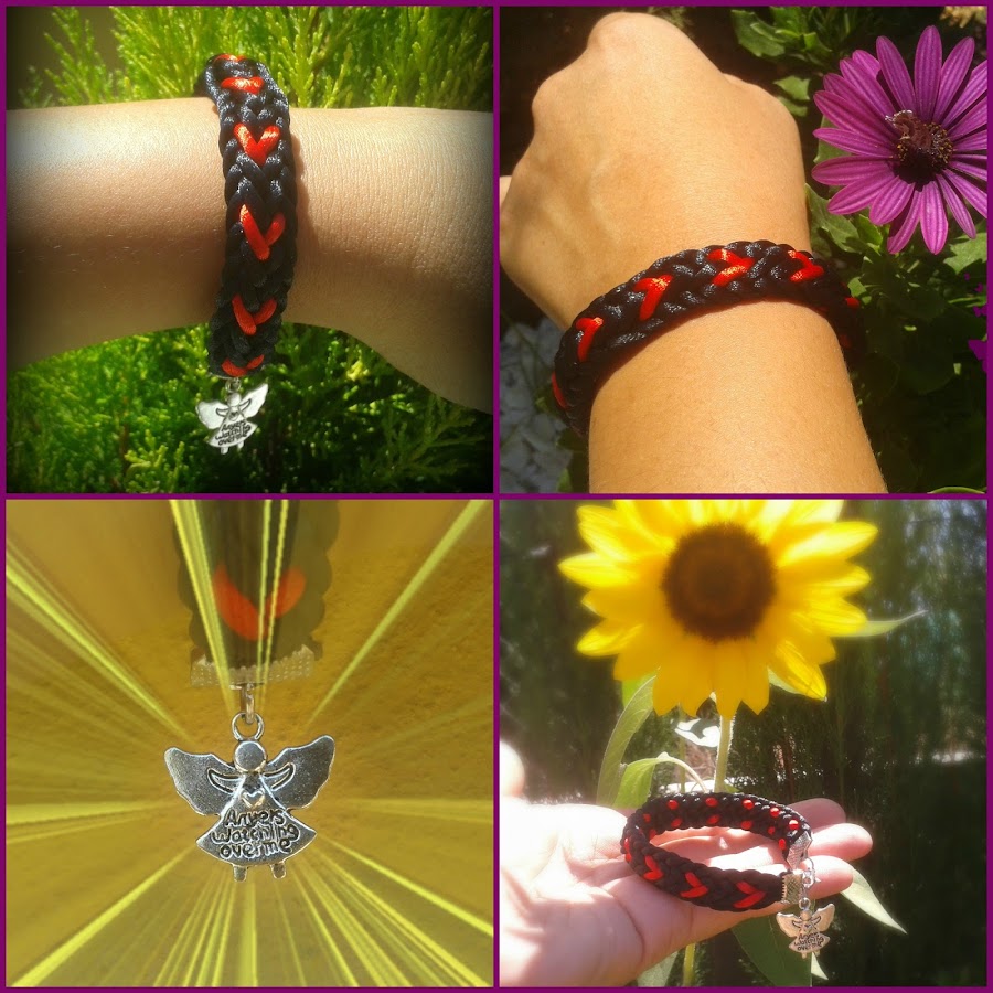 En la página de "Facilísimo.com" ha tenido mucho éxito mi pulsera de Kumihimo cuadrada con corazones que publiqué en la entrada anterior, y he querido hacer otra en negro. Espero que os guste: