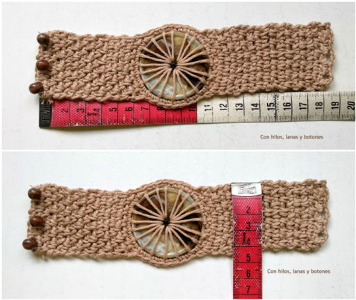 Repetimos la fila 2 hasta alcanzar la medida deseada. Si os fijáis el punto hace una especie de V o grano de café o semilla, yo tejí 15 filas de este punto. Más abajo os dejo las medidas de mi pulsera, pero como no todas tenemos la muñeca del mismo tamaño os cuento cómo adaptar las pulsera para vosotras. Colocáis el botón en el centro de vuestra muñeca y la tira tiene que llegar hasta la mitad de la cara interior de la muñeca.