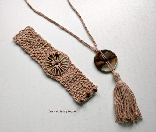 Los botones de la bolsita de La tienda del botón me están dando mucho juego. Hace unos días os enseñé cómo hacer la cinta aperta, que es una cinta ancha para el pelo hecha con ganchillo y que cierra en la nuca con un botón. Unos días antes os enseñaba en Instagram un hecho con un botón y una borla. Y hoy me paso por aquí para enseñaros una pulsera a juego con ese colgante, la Pulsera Carey Mokka.