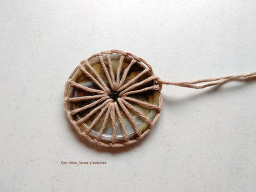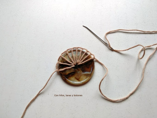 Empezamos cortando una hebra de unos 75 cm aproximadamente. Enhebramos una aguja lanera y hacemos punto festón directamente en el botón.