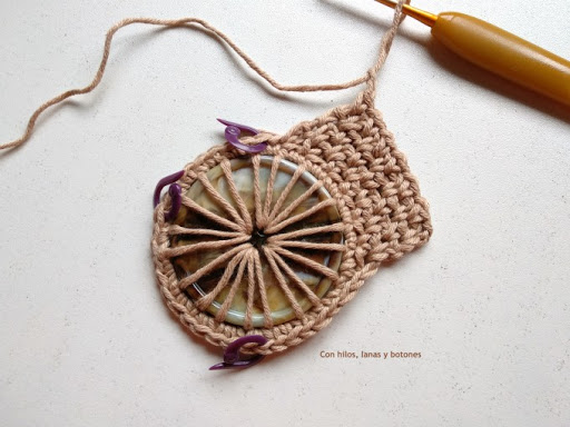 Ahora cogemos nuestro ovillo y la aguja de ganchillo. Hacemos 2 puntos bajos en cada punto festón alrededor del botón. Mientras hacemos estos puntos bajos aprovechamos para esconder las hebras que nos quedaron al hacer el festón. Al terminar queda un hueco entre el primer punto y el último que cerramos con un punto enano o punto raso.