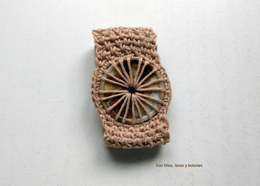 La pulsera lleva un botón de buen tamaño en el centro y las tiras van tejidas en ganchillo con punto ... bueno, en realidad no tengo claro cómo se llama este punto en castellano, yo lo he visto con varios nombres en inglés: Granite Stitch, Moss Stitch, Seed Stitch. Se llame como se llame os diré que es un punto sencillo, que alterna puntos bajos y cadenas al aire y va genial, entre otras cosas, para bolsos porque queda con textura. De hecho ya lo usé en el Clutch rústico "Bomull-Lin" (patrón gratis) y es el mismo que lleva el gorro de Rubén. Es un punto muy sencillo y ya veis que muy versátil.