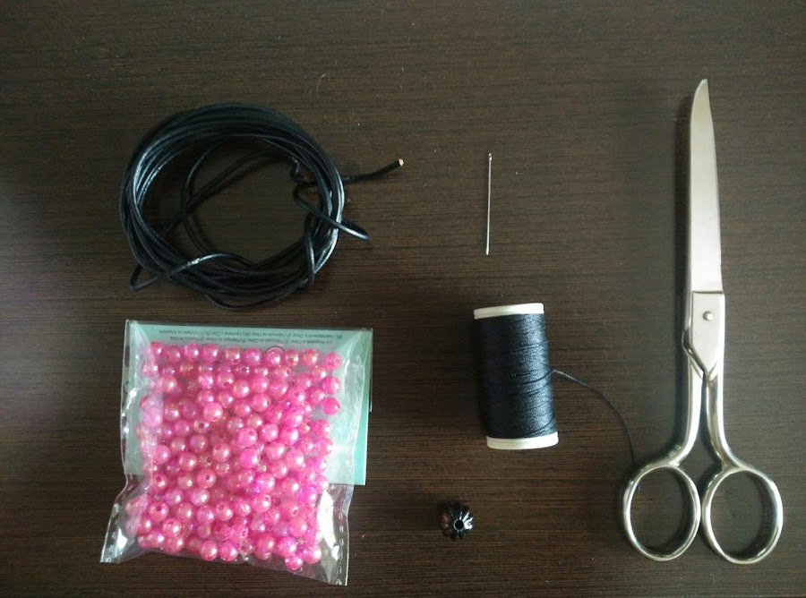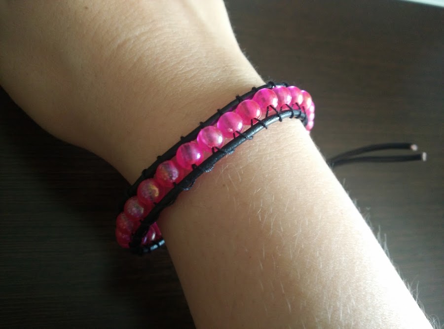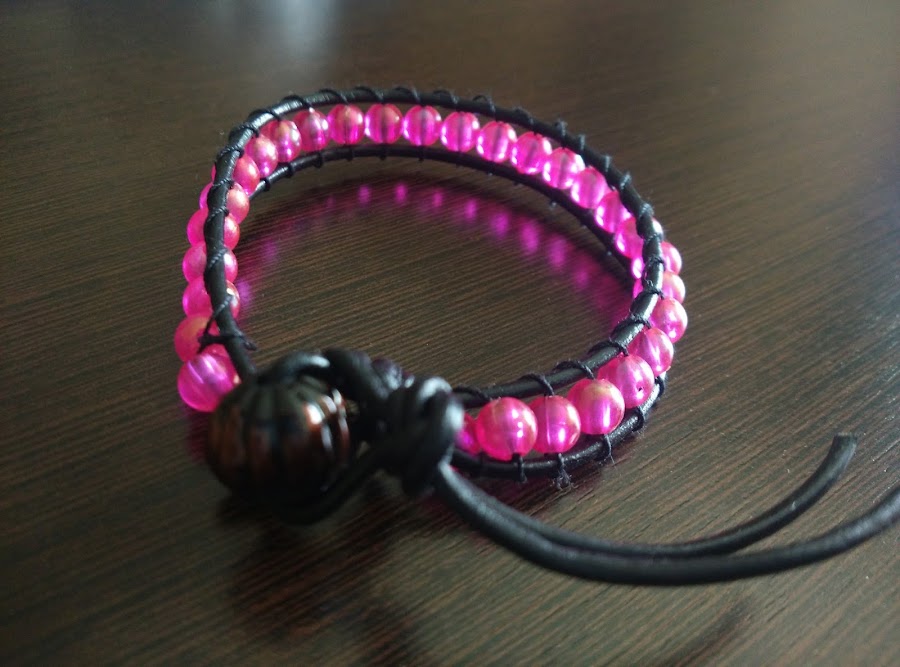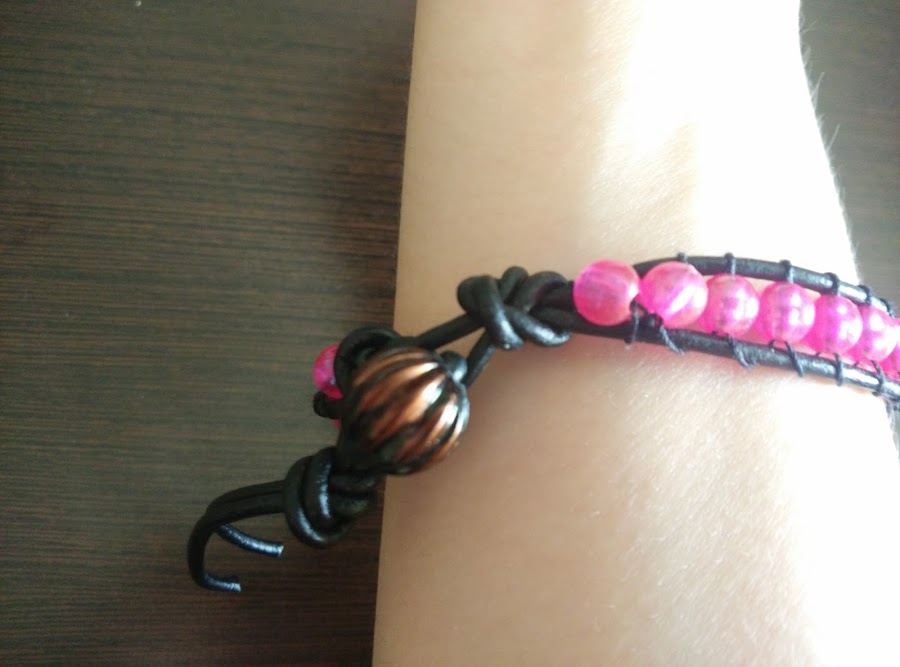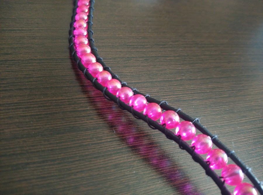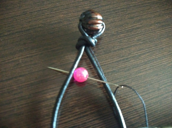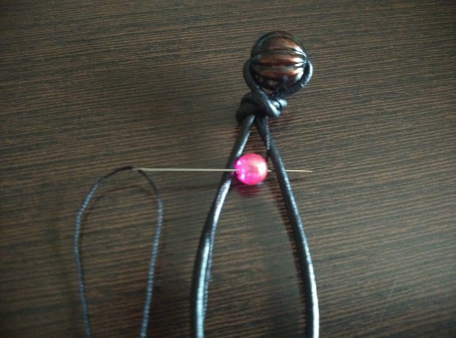 Enhebra la aguja e inserta la primera cuenta, pasa el hilo por encima del cuero de la derecha y por debajo del cuero de la izquierda, y estira.