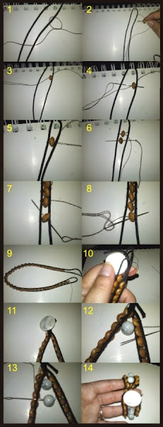 PASO 4: Os quedara una tira llena de abalorios. Juntamos los dos extremos, enrollamos hilo para que queden unidos y cosemos el botón que es el que nos servirá de cierre de la pulsera.