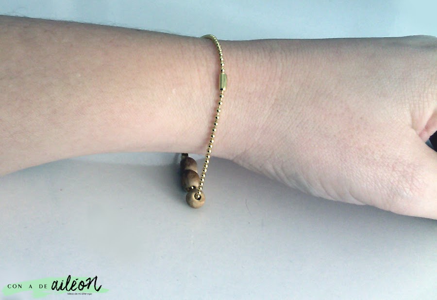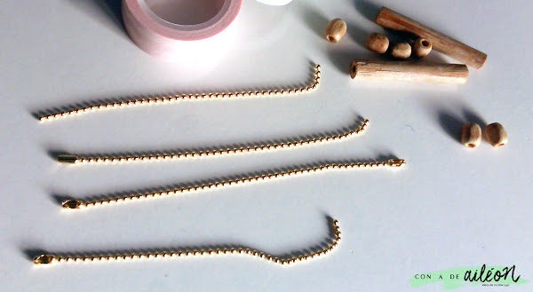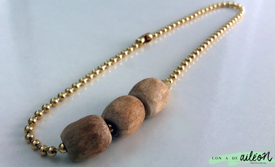 Sabéis de las cadenitas que vienen muchas veces cuando compras una prenda de ropa, verdad? estas pequeñitas de bolitas? Pues yo tengo varias, tanto plateadas como doradas, así que juntando dos, tenía pensado hacer antes o después algún DIY, y hoy me ha venido genial para la propuesta de diymaniacas de abril con bolitas de madera.
