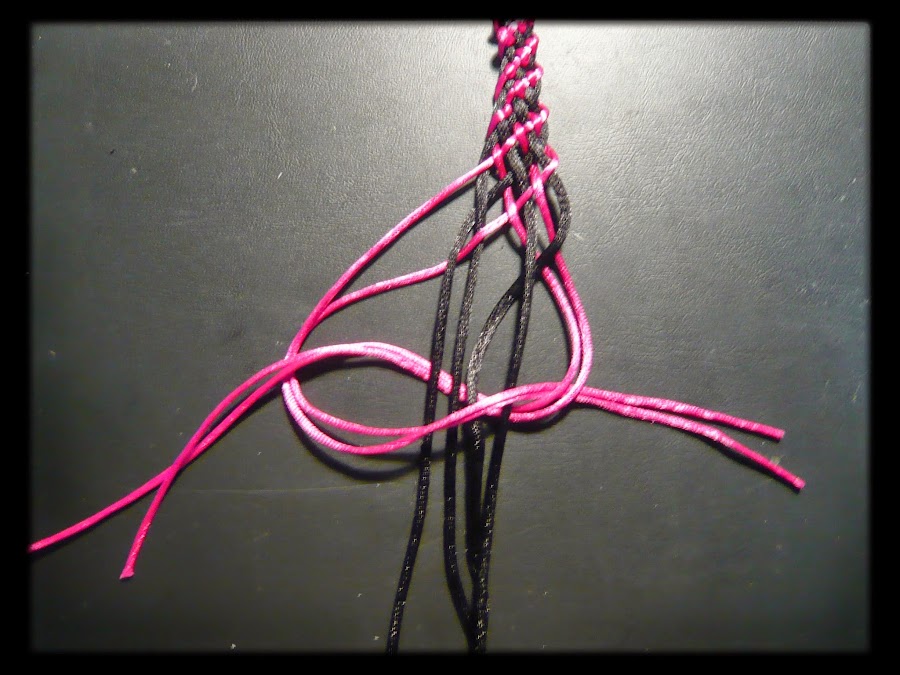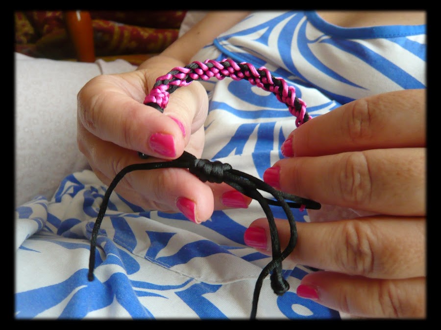 Cuando la tengas, saca la pulsera del disco y vamos a cerrarla. Anuda las cuatro tiras rosas entre sí y las dos negras exteriores entre sí. Deja las dos tiras interiores. Para que no se deshaga el nudo y el acabado sea mejor, quema con el mechero las puntas de los cordones tras córtalos.