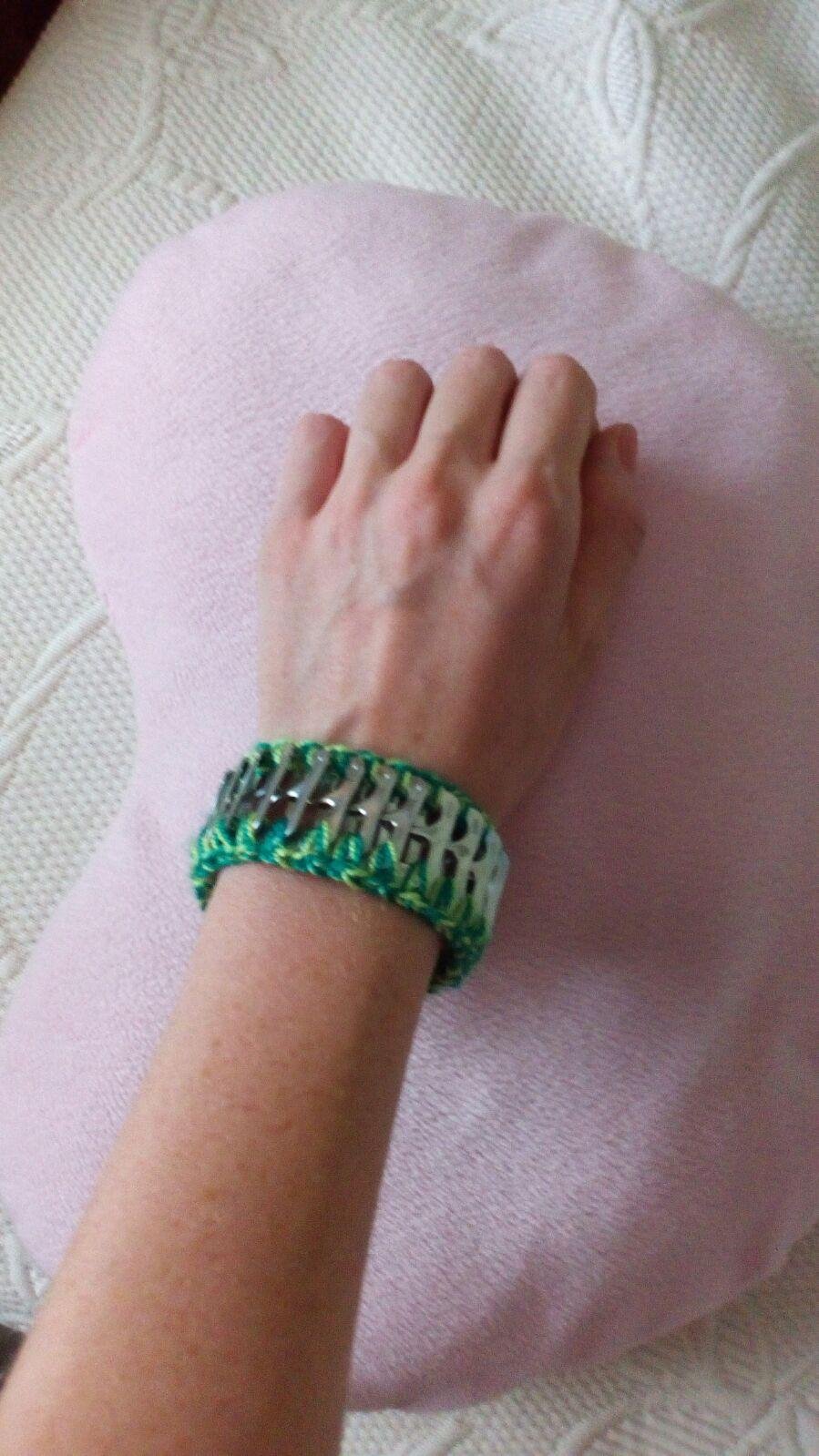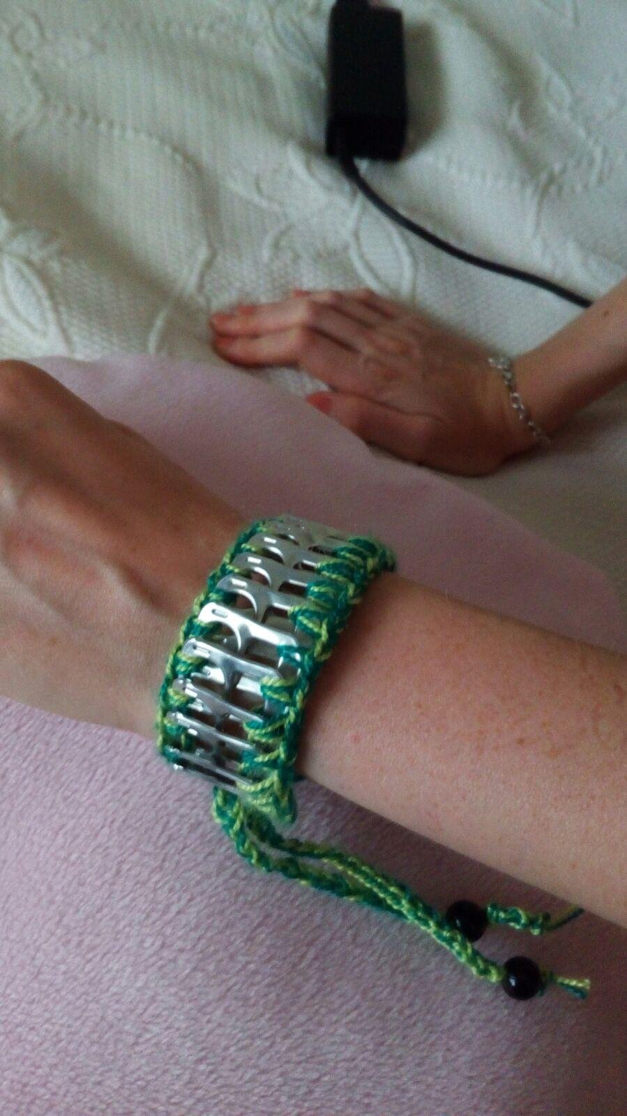 Antes que nada, vamos a comenzar haciendo una cadeneta de unos 30 puntos, a continuación hacemos un punto bajo en el lateral de una anilla enganchándola así al tejido. Hacemos un punto más y al llegar a la curva hacemos 3 puntos al aire para salvarla. Seguidamente hacemos otro punto bajo ya en la parte de arriba e incluimos otra anilla. Tapamos la mitad de la anilla ya tejida con la nueva dejando un hueco en medio donde introduciremos el ganchillo para hacer otro punto bajo. A continuación hacemos uno o dos puntos al aire para que quede más holgada la pulsera y continuamos enganchando anillas. Cuando todas las anillas estén unidas (21 aprox), hacemos un punto antes de llegar a la curva del extremos para poder realizar los tres puntos al aire. Una vez hechos, hacemos dos puntos bajo en el lateral, tres al aire para salvar la junta y volvemos ha realizar dos puntos bajos. En este momento llegamos a otra curva y hacemos tres puntos al aire. Ya le hemos dado la vuelta a la pulsera y solo nos queda tejer la parte de abajo de las anillas que lo haremos de las misma manera que al principio. Al llegar al final volvemos a tejer una cadena de 30 puntos.