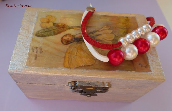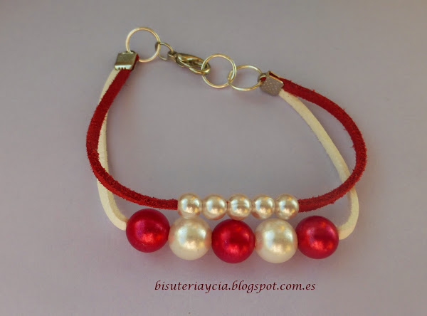 Y en el hilo de antelina blanco enfilaremos 3 bolas rojas y 2 perlas de 8 mm, alternándolas.