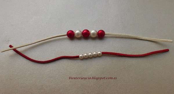 En el hilo de antelina rojo enfilaremos 5 perlas de 4 mm.