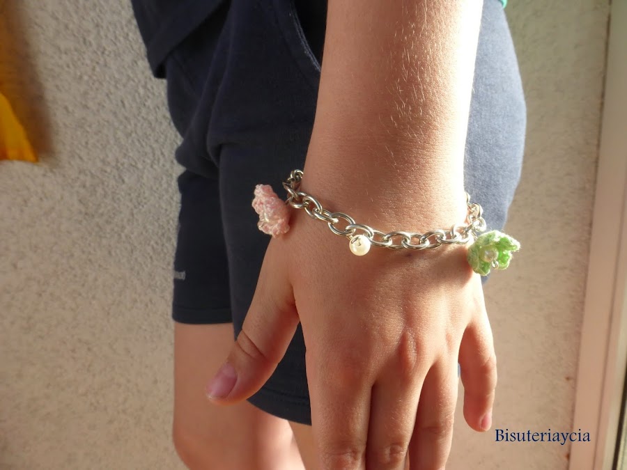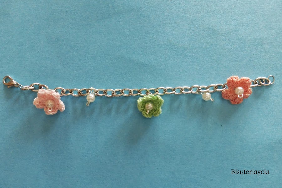 Hoy vamos hacer una pulsera de cadena, utilizando unas pequeñas florecitas de crochet y unas perlitas.