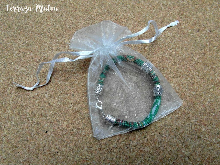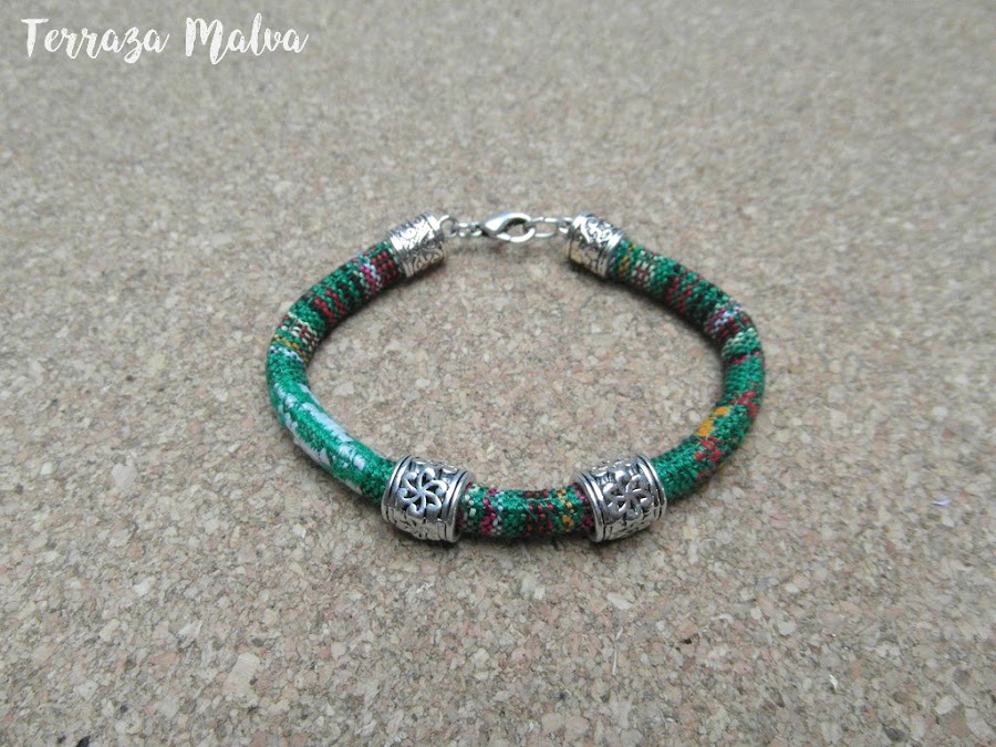 Está confeccionada con cordón de tela en tonos verdes y terminales y piezas plateados.