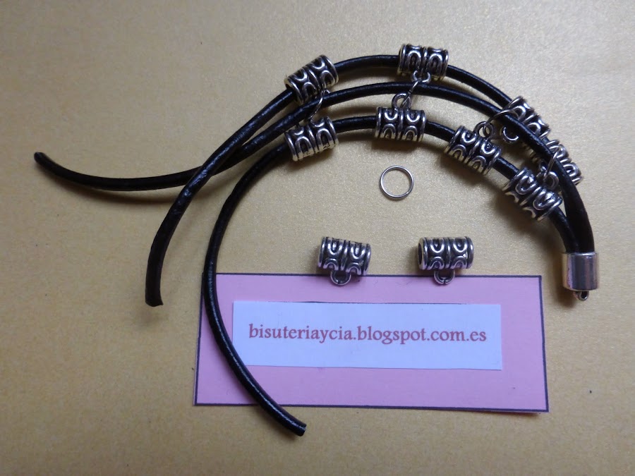 Cuando estén bien pegadas enfilaremos los rodeles en las las dos tiras de cuero exteriores y en la tira interior enfilaremos anillas con las que uniremos los rodeles de ambos lados de la pulsera.