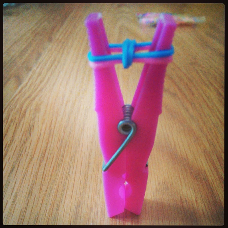 Lo primero es coger la primera goma, ponerla en foma de "infinito" en la parte superior de la pinza y queda así: