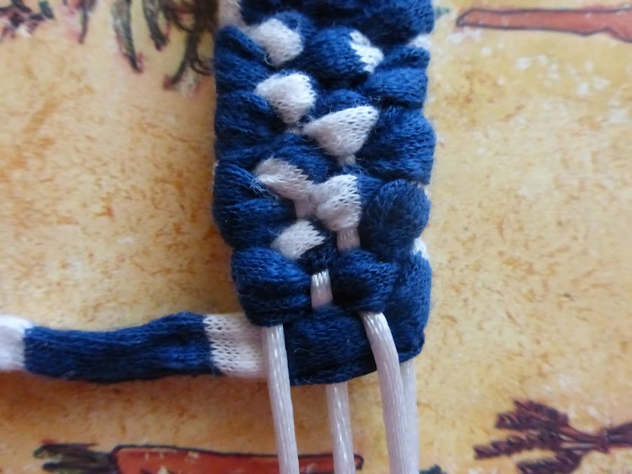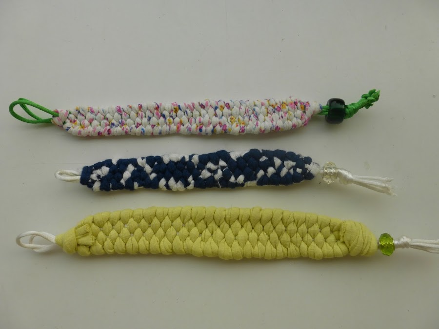 Cuando tengáis la medida deseada anudad el trapillo en los dos extremos, en un extremo os debe quedar la cola de ratón en forma de anilla, en el otro extremo los cuatro hilos. A continuación colocaremos un botón, una bola, cualquier abalorio que tengáis y que pase por la anilla que habéis formado, haremos un nudo con todos los hilos, podéis acabar colocando unas bolitas a cada hilo o hacer un simple nudo.