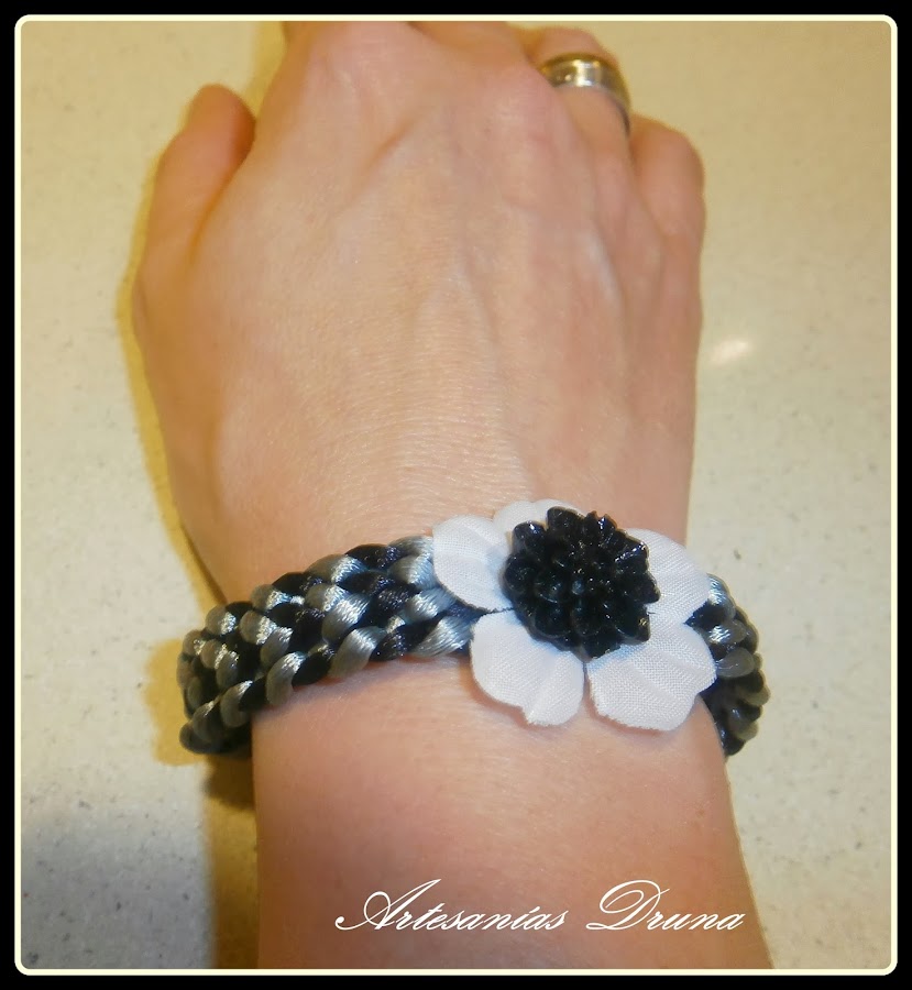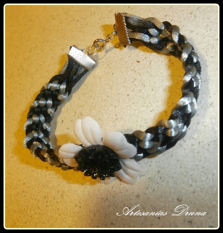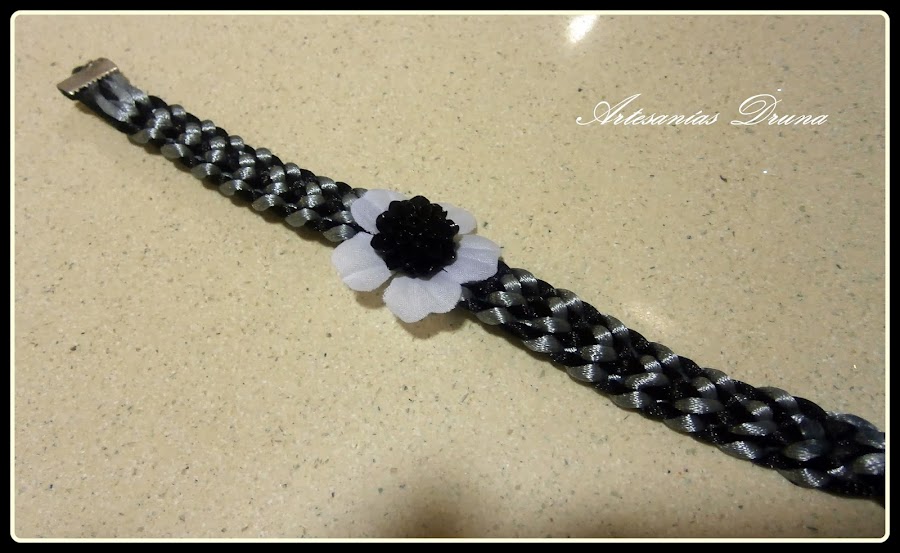 PULSERA GRIS NEGRA CON FLORES ACRÍLICA Y DE TELA
