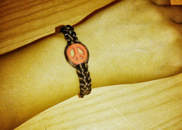 Pulsera macramé con una pieza del signo de la paz en el medio. ·Cierre Fácil. ·Colores: El hilo Marrón y la pieza del signo de l ...