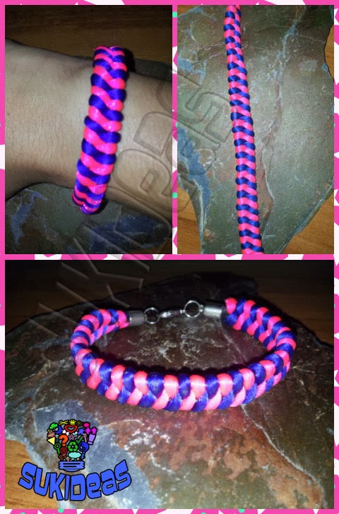 Se trata de una pulsera que hice en verano como se puede ver por los colores tan vivos, el nudo se llama nudo pez y el cordón es cola de ratón.