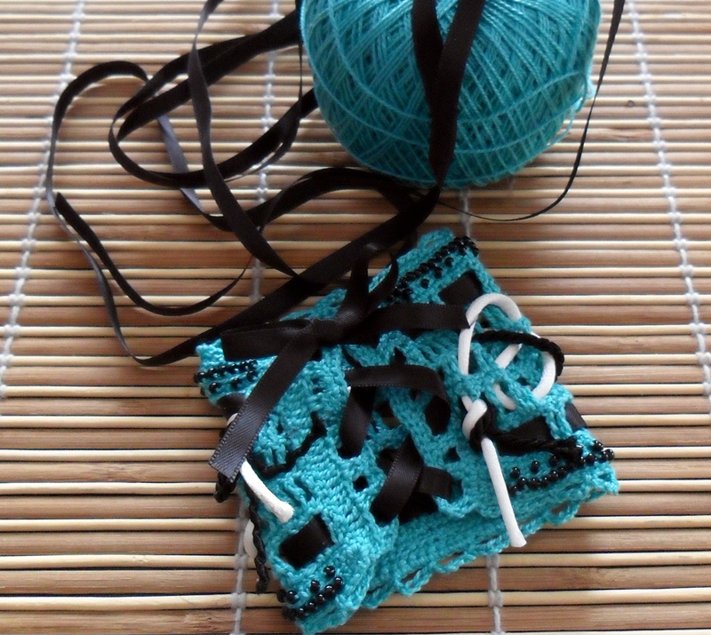 Esta realizada con ganchillo y se va realizando el diseño a medida que se avanza en el trabajo. Para crearla utilizamos hilo de algodón puro, rocallas negras, cinta blanca y cordón negro.