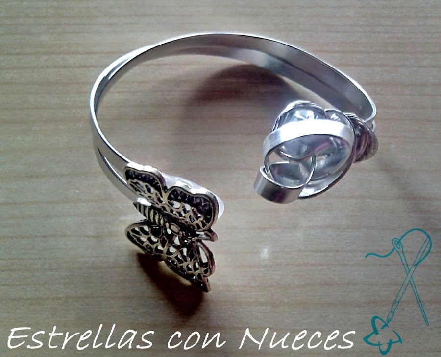 A continuación le damos forma redondeada al resto de alambre para que coja la forma de una pulsera, y en el otro extremo, con la silicona caliente pegamos el abalorio!