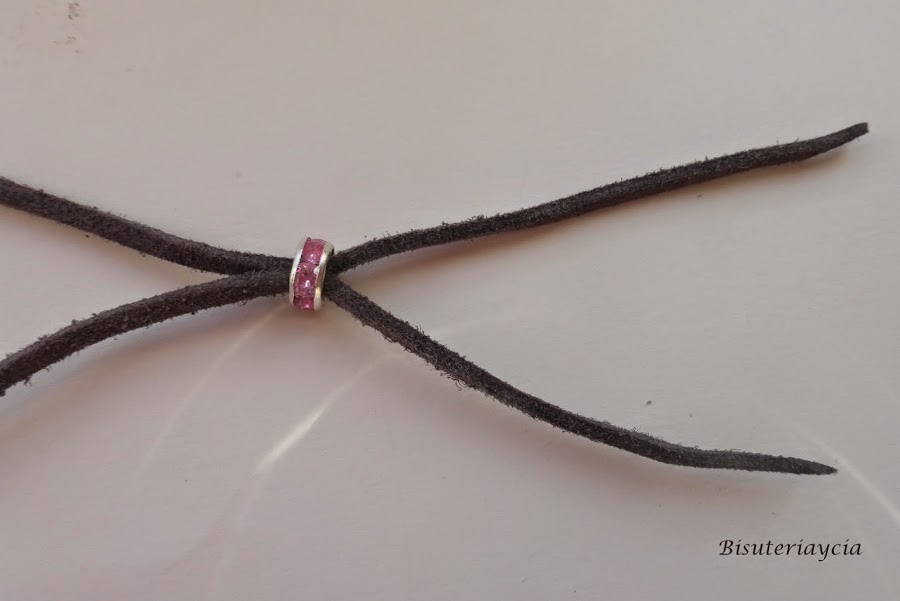 Para hacer el cierre solo hemos de juntar los dos extremos de la pulsera y pasarlos por el interior de la pieza escogida para el cierre, en mi caso un rondel de strass.