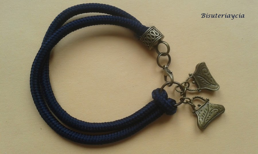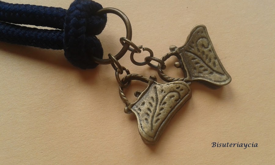 Una vez hecho el nudo uniremos los colgantes a la anilla, para esta pulsera he escogido unos bolsos estilo "Vintage".