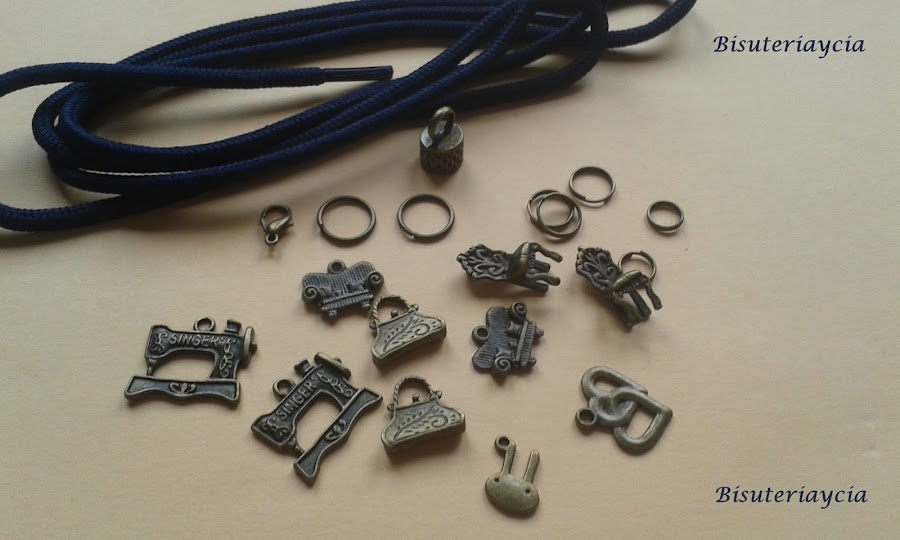 Como veis en la imagen vamos a utilizar: cordón, una anilla grande, un capuchón, anillas medianas, anillas pequeñas y los colgantes que mas os gusten.