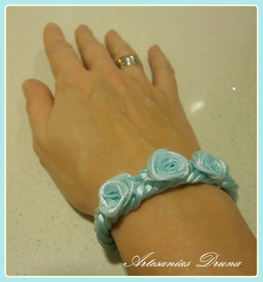 PULSERA TRENZA DE NUEVE CABOS CELESTE CON ROSITAS