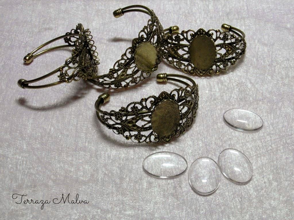 Para realizar estas pulseras se adquiren dos elementos: la base de la pulsera con camafeo y el cabuchón de resina.