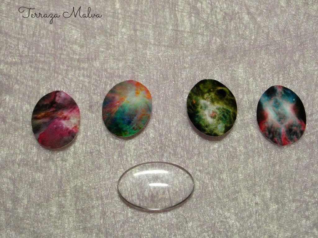 La realización es muy simple. Se recorta el motivo a utilizar en el camafeo. Puede ser una fotografía o ilustración o incluso un trocito de tela. Yo he utilizado imágenes de Hubble que he reducido hasta un tamaño que cuadraba con el tamaño del camafeo, las he imprimido en papel fotográfico satinado y las he recortado sirviéndome de guía con un cabuchón.