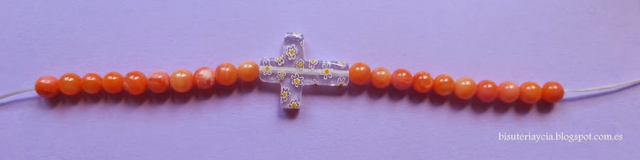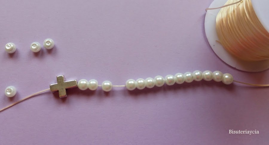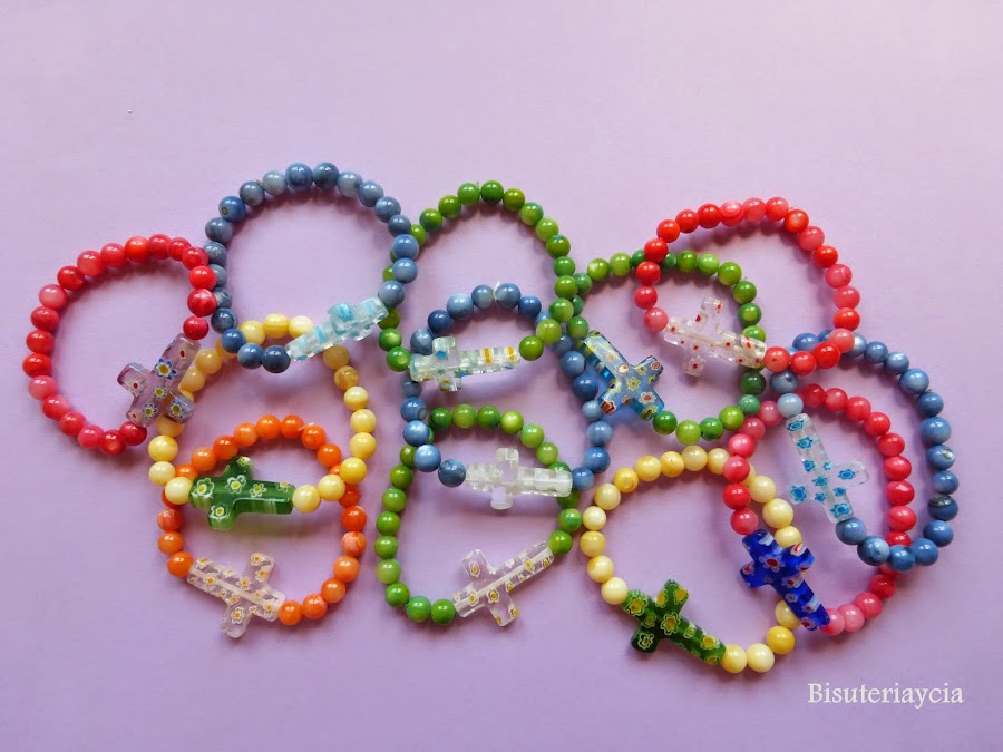 Para realizar las pulseritas de las niñas hemos utilizado cruces de cristal mil flores y bolitas de nacar de colores, hacerlas es muy fácil solo hemos de enfilar las piezas en hilo de silicana y cerrarlas con un nudo.