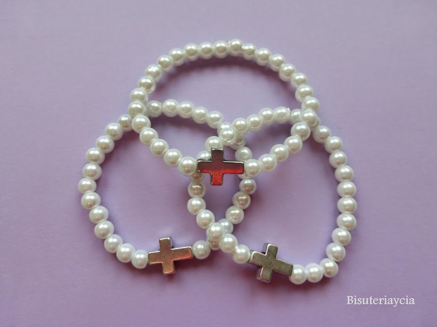 Para las pulseras de los adultos hemos utilizado cruces de plata antigua y perlas cultivadas.
