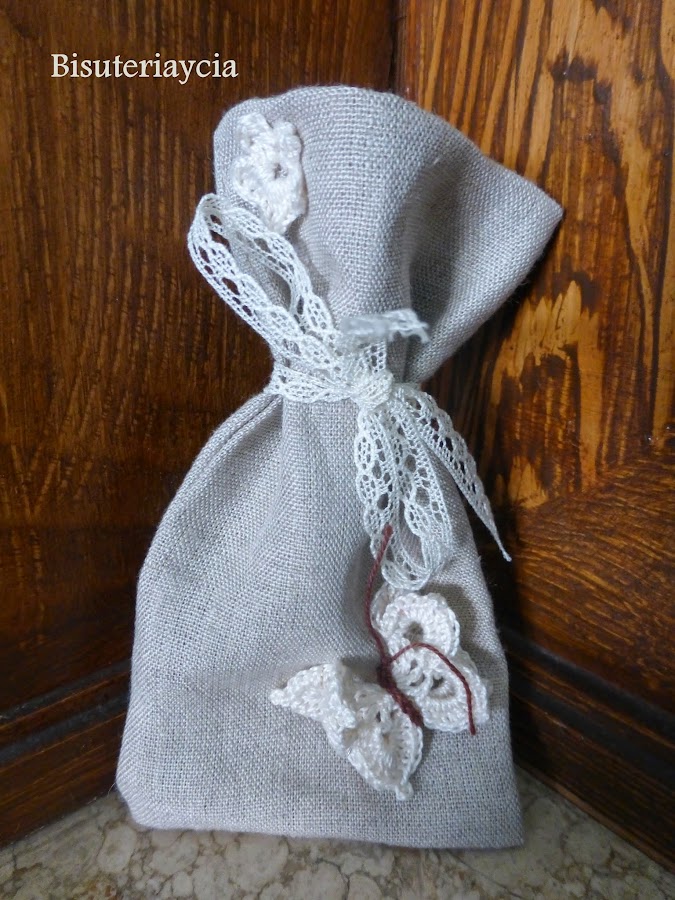 Las pulseritas irán dentro de unas bolsitas de hilo con una una flor y una mariposa hechas de ganchillo.