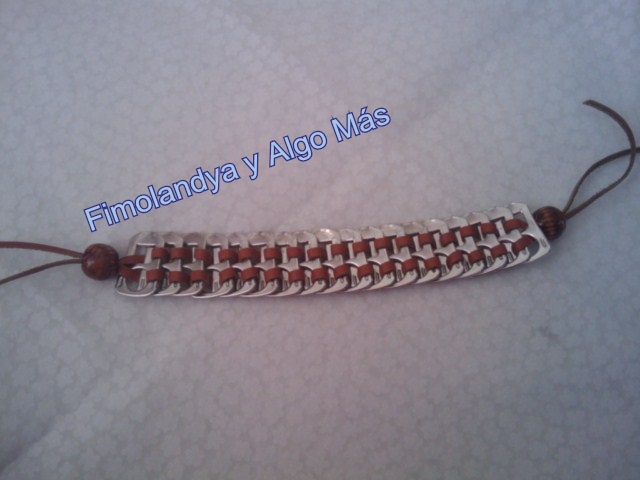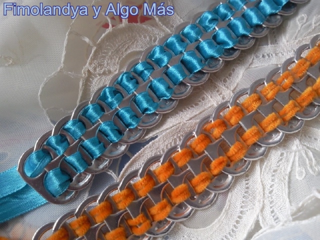 Tan sólo hay que hacer grupos de 3 anillas, montando la de en medio sobre las otras dos e ir introduciendo los lazos enlazados entre los huecos de las anillas. Podemos ponerles lazos, cordón de cuero o el material que más nos guste o tengamos a mano.