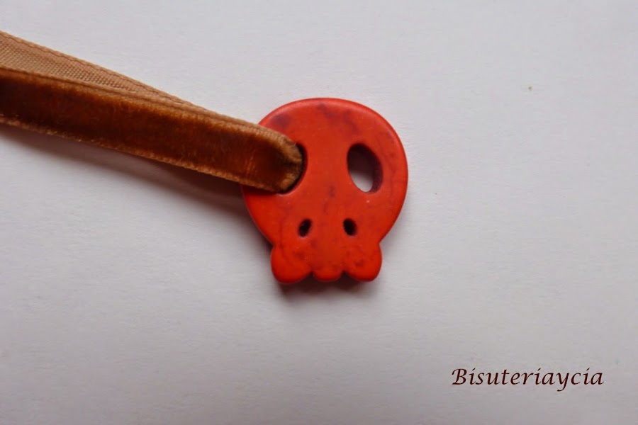 Para hacer la pulsera empezaremos cortando dos trozos iguales de cinta o hilo y los pasaremos por el interior de los ojos de la cabeza de esqueleto.