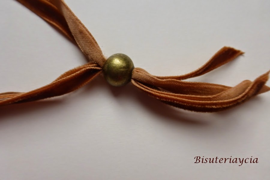 Una vez enfilada las piezas en los laterales vamos a cerrar la pulsera, para ello debemos pasar todos los extremos de la cinta por el interior de la entrepieza seleccionada para el cierre.