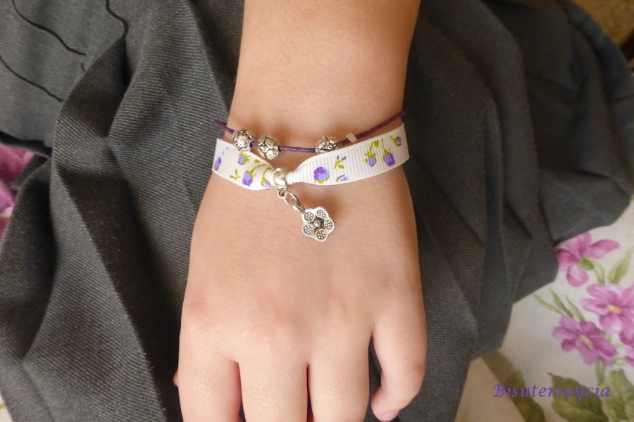 Este por ejemplo es otro modelo, la cinta la escogió mi hija, es muy coqueta, combine la cinta con un hilo color lila que combina la perfección con las flores y el colgante se lo puse en la pieza central de la pulsera.