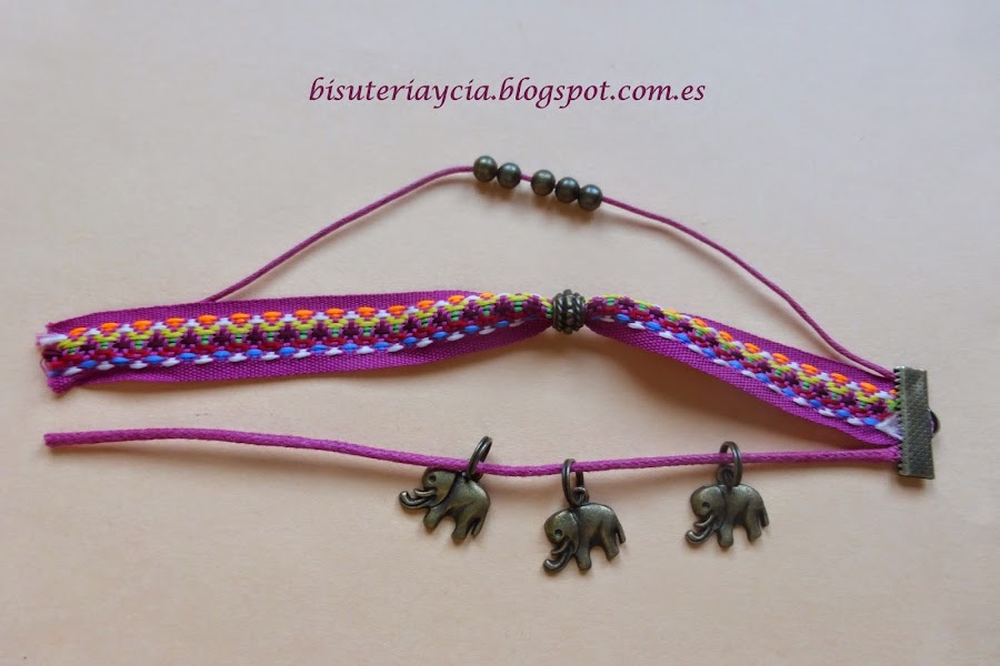 En esta pulsera por ejemplo he colocado unas bolitas en el cordón mas delgadito 1mm, en la cinta he puesto una pieza central y en el cordón mas grueso 2mm he colocado unos colgantes de unos simpáticos elefantes que le dan a la pulsea un aire mas étnico.