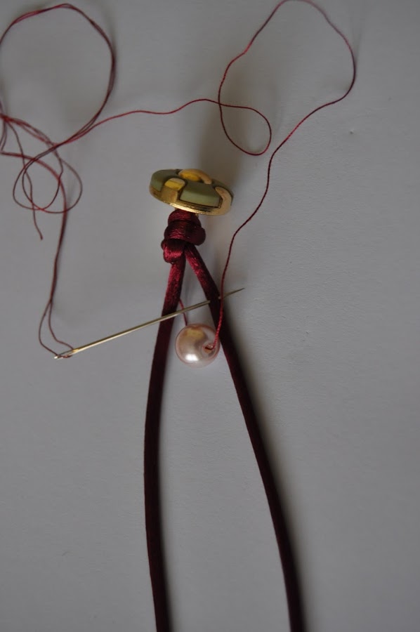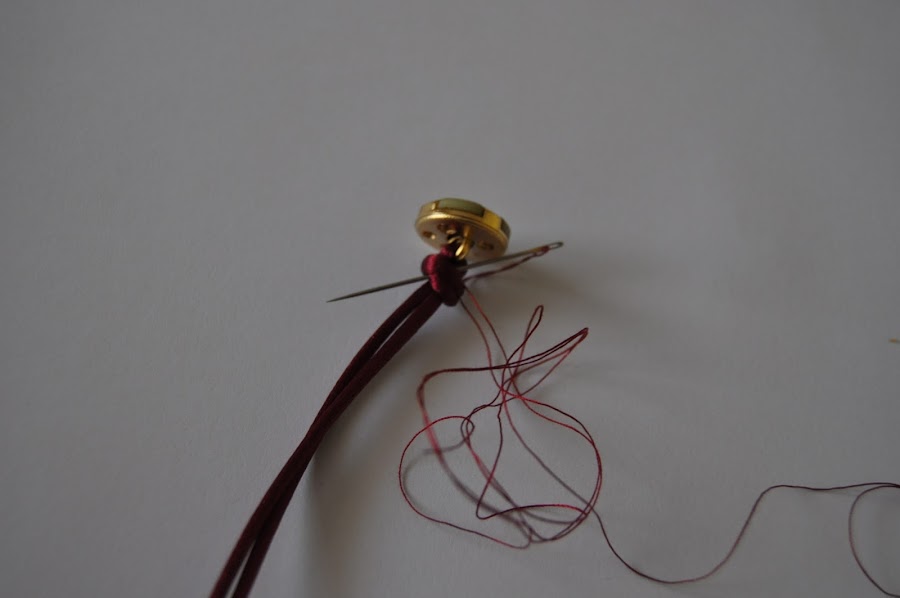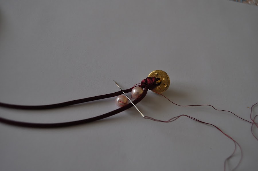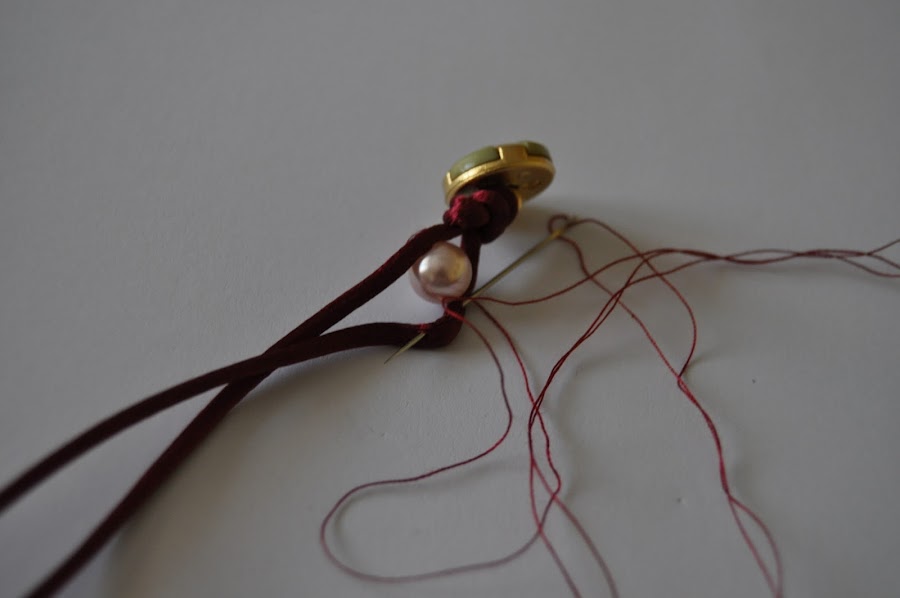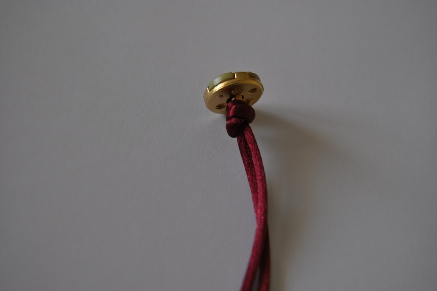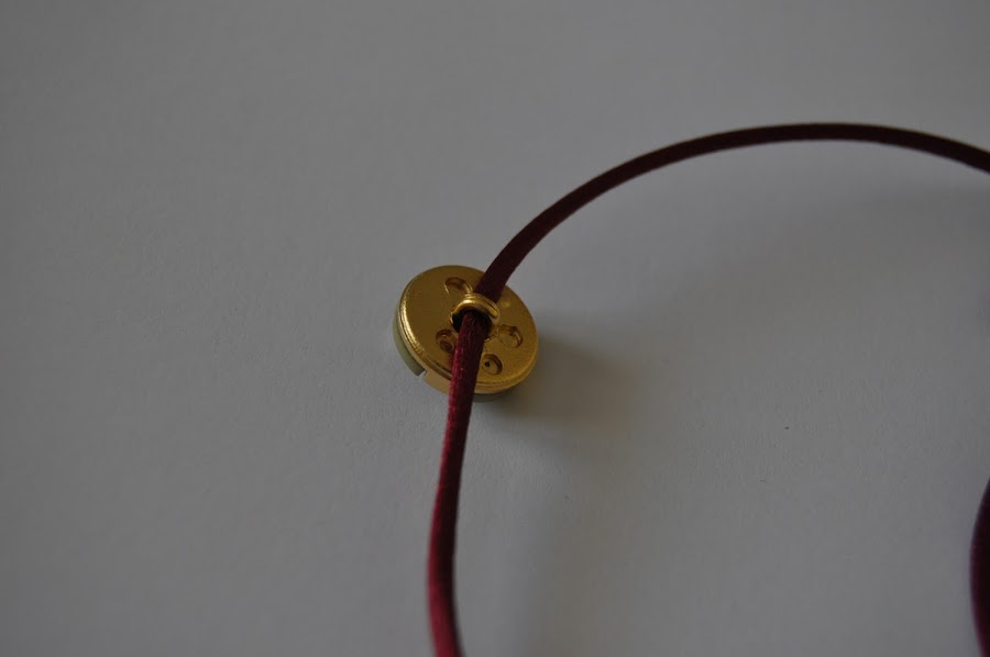 La cola de ratón se mete por la anilla del botón, se hace un nudo y empezamos a unir las perlas al cordón pasando la aguja por el agujero de la perla, en este caso, o de cualquier otro abalorio. Se termina con un nudo, se deja un poco para abotonar la pulsera y se termina con otro nudo. La terminación se cierra quemando el extremo de la cola de ratón.