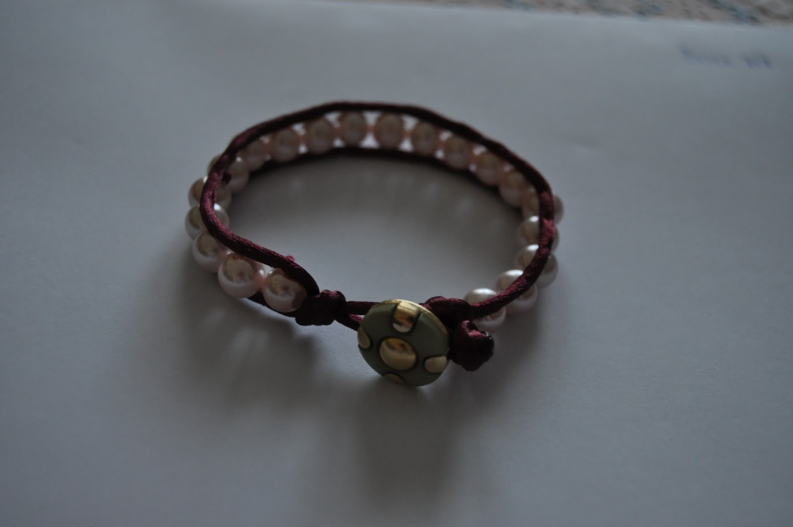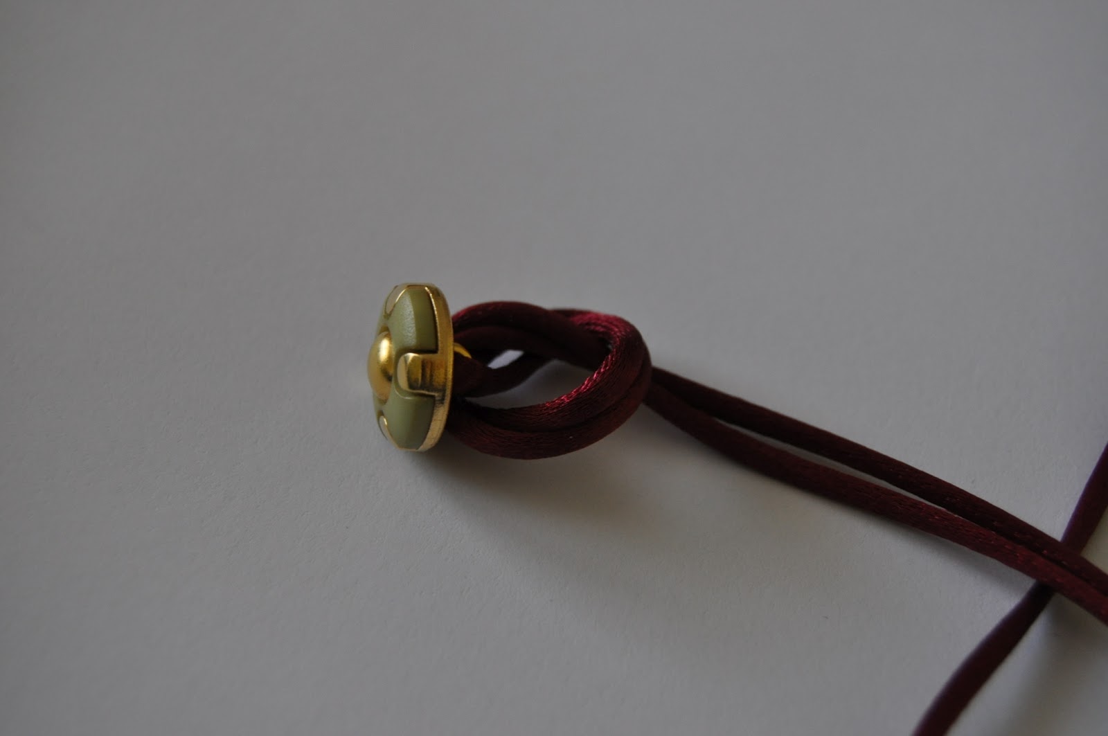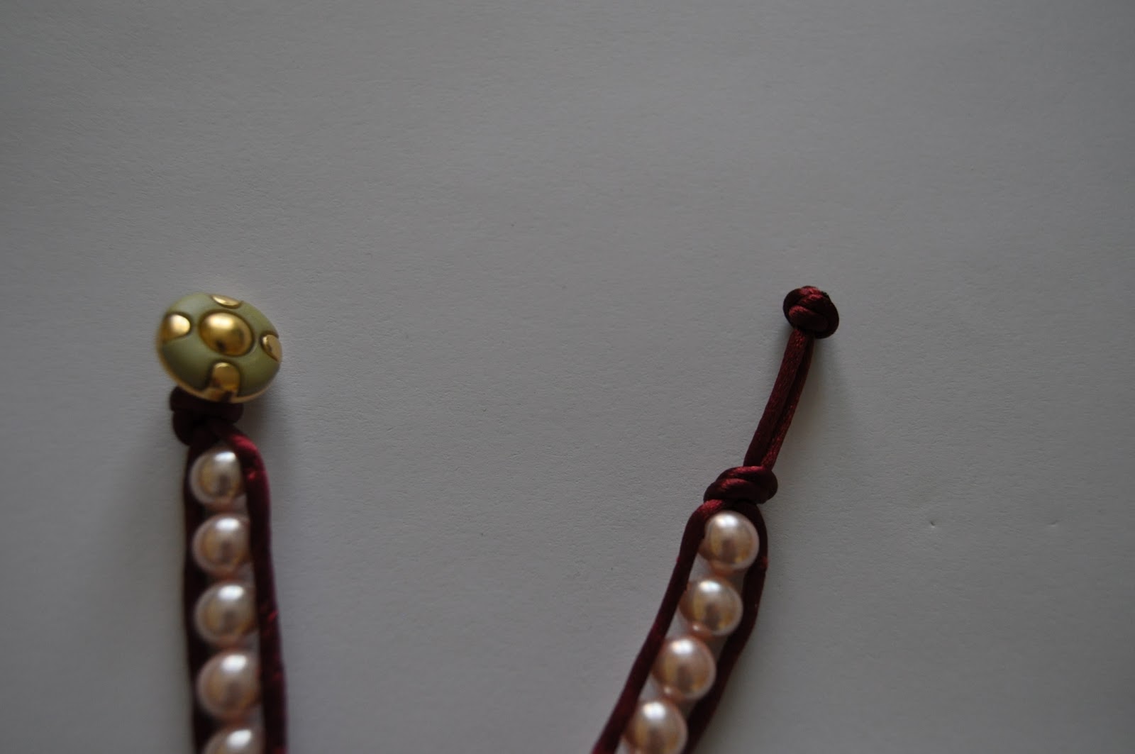 La cola de ratón se mete por la anilla del botón, se hace un nudo y empezamos a unir las perlas al cordón pasando la aguja por el agujero de la perla, en este caso, o de cualquier otro abalorio. Se termina con un nudo, se deja un poco para abotonar la pulsera y se termina con otro nudo. La terminación se cierra quemando el extremo de la cola de ratón.