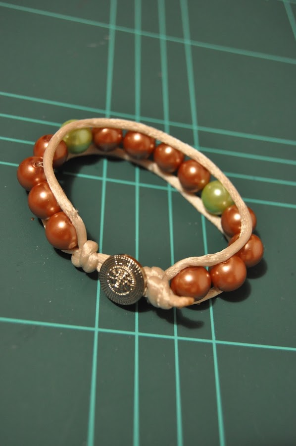 Ayer por la tarde, Lucía, una amiga con la que nos juntamos unas cuantas para hacer manualidades, nos enseñó a hacer una pulsera con cola de ratón y abalorios. Aunque a mí la aguja no me gusta mucho y ahora mismo me resulta difícil cualquier trabajo en la que haya que utilizarla, éste no requería demasiado esfuerzo y aquí está el resultado.
