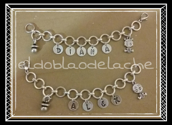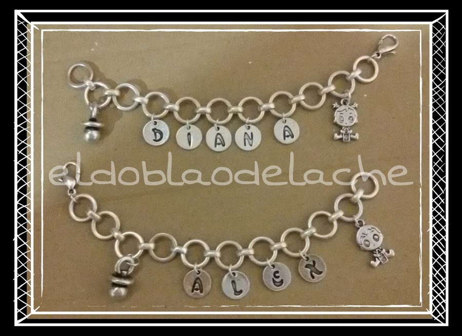 En material de zamak con baño de plata.Con colgantes de medallas formando nombre y charms de chupete y bebé.