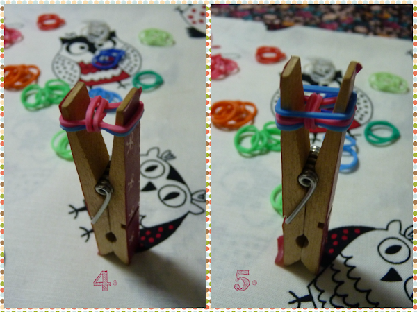 5. Como veréis, ahora solo tendremos dos gomas. Pondremos una tercera como hicimos en el paso 3. En la pinza siempre tiene que haber 3 gomitas.