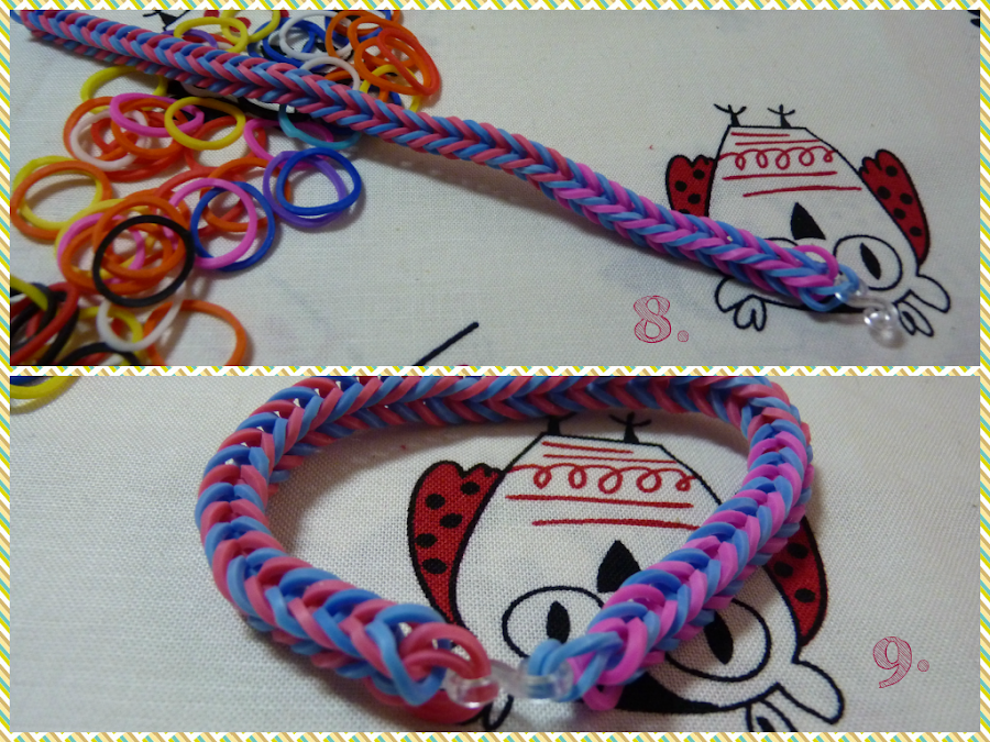 9. De la otra punta de la pulsera hacemos lo mismo, cogemos las dos gomitas del inicio y las metemos por la otra abertura del cierre.