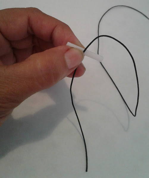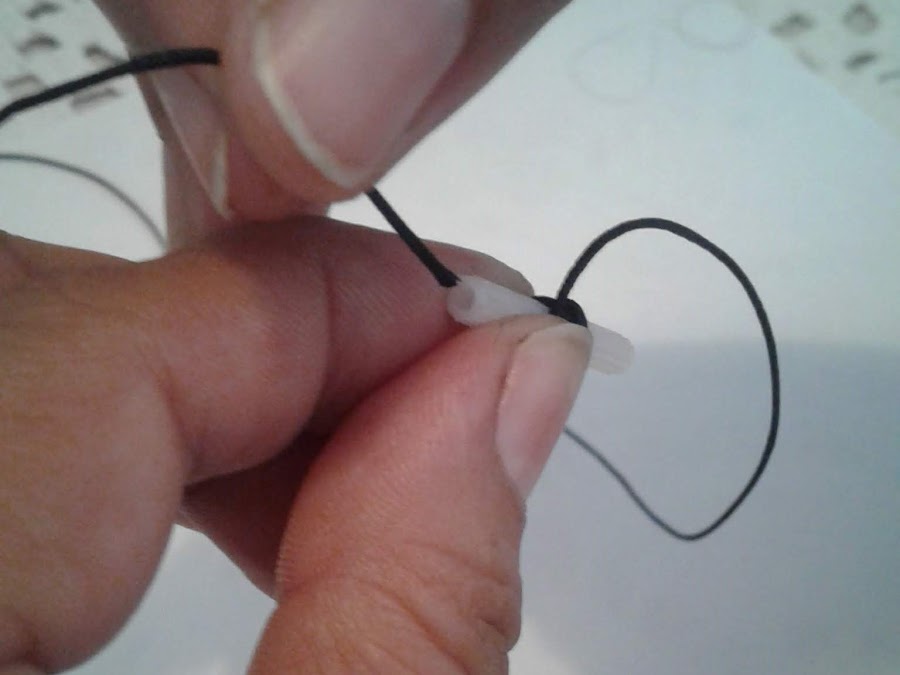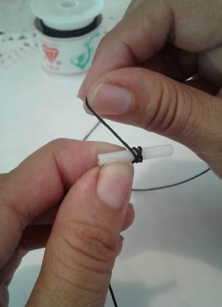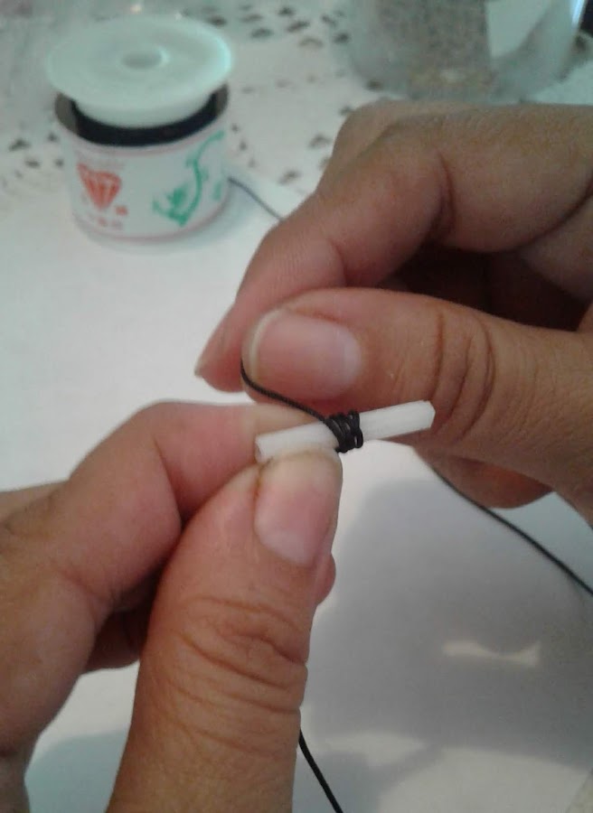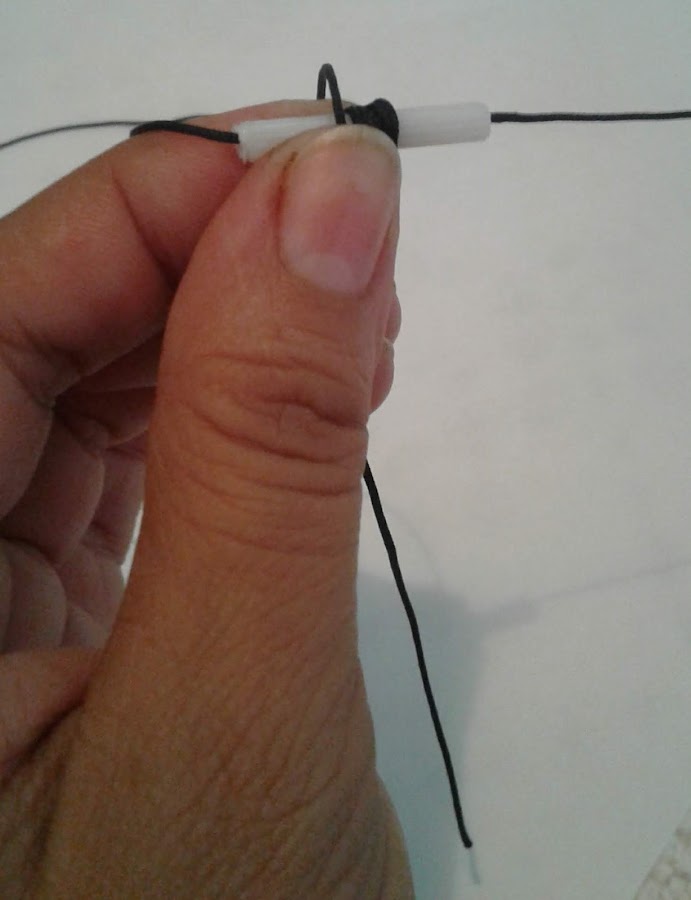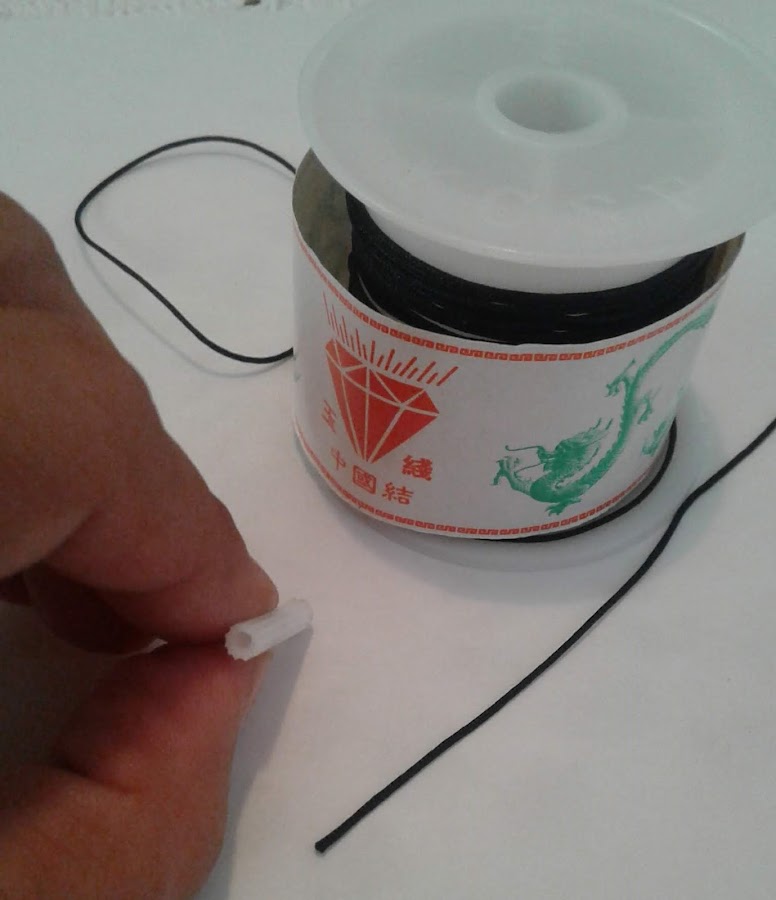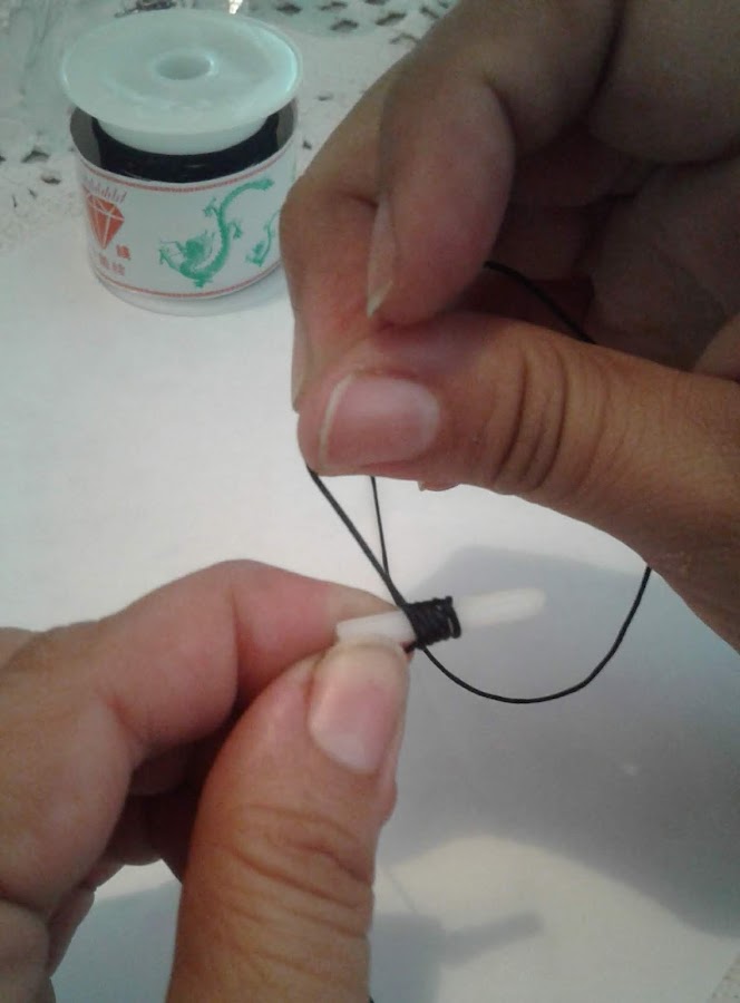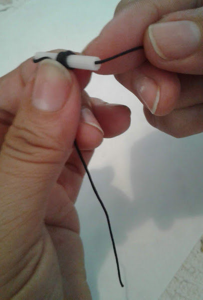5.- Ese extremo del cordón, que enrolle 5 veces, lo introduzco por el pequeño orificio de la pajilla.