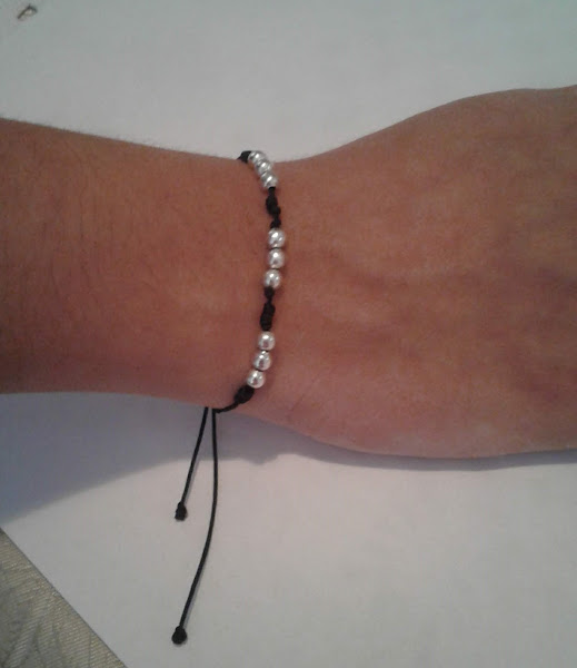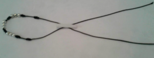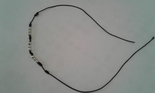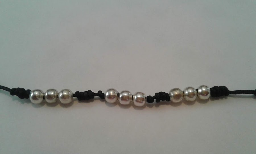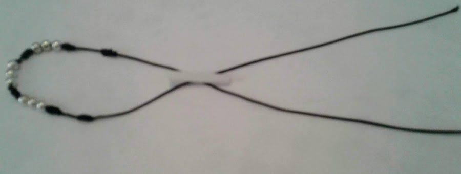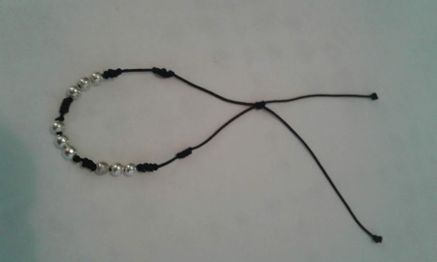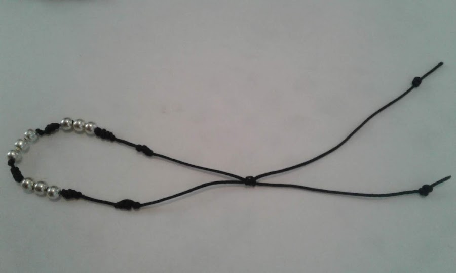 8.- Se realiza el diseño, en este caso: nudo, espacio, nudo, tres cuentas de metal plateadas, nudo, se repite tres veces.
