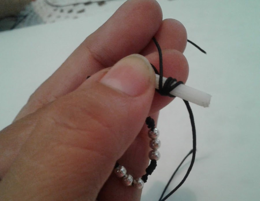 9.- Para cerrar y abrir la pulsera, se realiza otro nudo franciscano. Se coloca un extremo sobre el otro y encima el pitillo, tomando el hilo que dejamos debajo para enrollarlo cinco veces, pasarlo por dentro de la pajilla y formar el nudo.