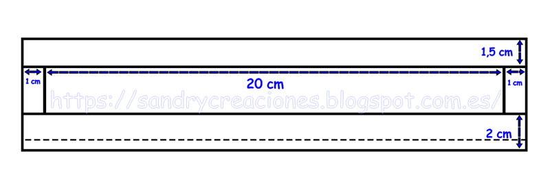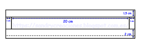 Para realizar estas pulseras primero realizamos un patrón de la pulsera con el ancho deseado y la longitud de nuestra muñeca teniendo en cuenta el tipo de cierre que le queramos poner, seguidamente al rectangulo le añadimos varios margenes que nos servirán para dejar mas pulida y bonita la pulsera, podéis ver el patrón y las medidas en el esquema siguiente: