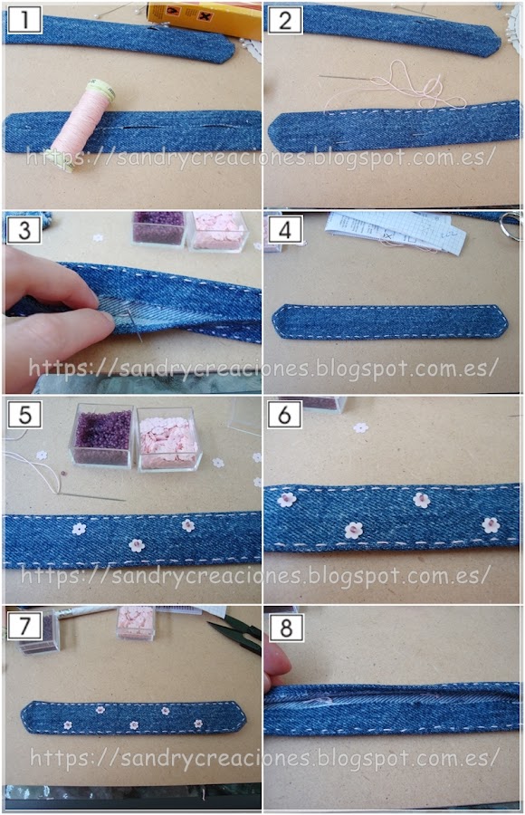 Como primera decoración para la pulsera de chica le haremos un borde con punto de embaste (imágenes 1 y 2) con un hilo vistoso y un poco más grueso que los normales para coser, para que se vea tanto por delante como por detrás. En este caso hemos escogido un hilo de color rosa del grosor de hilo como los que se utilizan en pantalones vaqueros. Como decoración de la parte central hemos escogido unas lentejuelas en forma de flor y unos abalorios para el centro de la flor y se las hemos cosido distribuidas por la pulsera (imágenes 5 y 6). Una vez decorada (imagen 7) ya solo nos queda cerrar la parte de atrás con silicona caliente o pegamento textil (imagen 8).